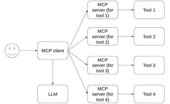 Figure: Simplified MCP architecture – an MCP client orchestrates interactions between the user’s request, a large language model (LLM), and one or more MCP servers (each providing access to specific external tools or data)[4][7]. The LLM’s output (a tool name and parameters) is routed to the appropriate MCP server, which executes the action and returns results for the LLM to incorporate into its final response.